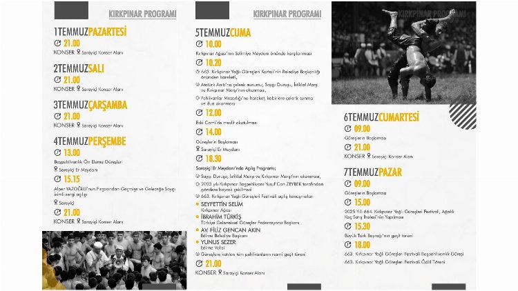 Kırkpınar Güreşleri’nin resmi açılış programı ise aynı gün saat 18.30’da Sarayiçi Er Meydanı’nda gerçekleştirilecek. Ayrıca 1 Temmuz Cuma akşamı Sarayiçi Konser Alanında, ünlü sanatçı Hüsnü Şenlendirici konser verecek.