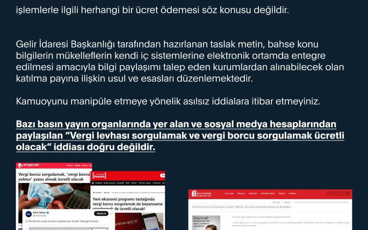 Vergi mükellefleri ve mali müşavirlerin, elektronik uygulamalar üzerinden; vergi kimlik numarası ve vergi levhası sorgulama ve doğrulama,  vergi beyannamesi gönderme, görüntüleme ve indirme,  vergi bilgileri sorgulama ve görüntüleme,  vergi borcu yoktur yazısı talep etme ve alma gibi işlemlerle ilgili herhangi bir ücret ödemesi söz konusu olmadığının altı çizilen açıklamada, “Gelir İdaresi Başkanlığı tarafından hazırlanan taslak metin, bahse konu bilgilerin mükelleflerin kendi iç sistemlerine elektronik ortamda entegre edilmesi amacıyla bilgi paylaşımı talep eden kurumlardan alınabilecek olan katılma payına ilişkin usul ve esasları düzenlemektedir. Kamuoyunu manipüle etmeye yönelik asılsız iddialara itibar etmeyiniz” ifadeleri yer aldı.