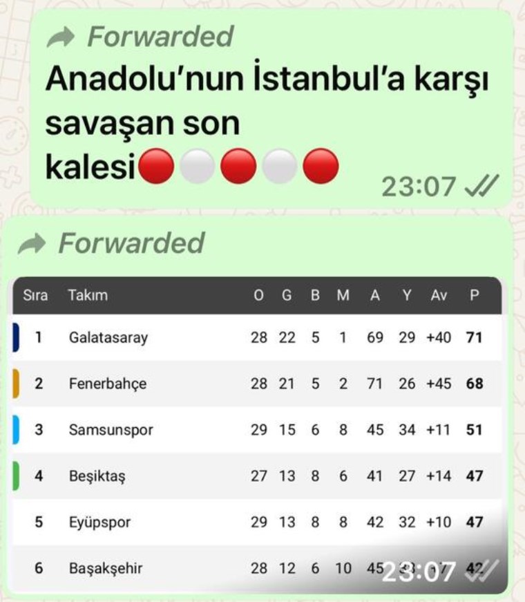Yüksel Yıldırım’ın paylaştığı iletide, “Anadolu’nun İstanbul’a karşı savaşan son kalesi” tabirleriyle birlikte Süper Lig puan tablosunun yer aldığı görüldü.