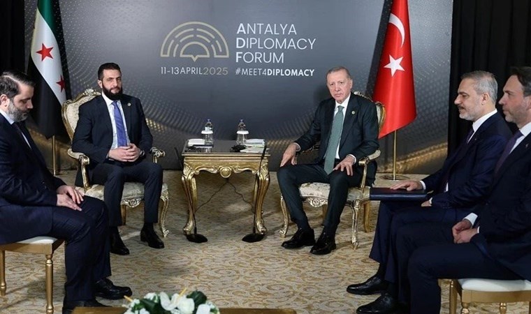 Cumhurbaşkanı Erdoğan, TRT’nin resmi irtibat sponsoru olduğu 4. Antalya Diplomasi Forumu için Antalya’da bulunan, Heyet Tahrir Şam örgütünün denetimindeki Şam hükümetinin temsilcisi Ahmed el-Şara ile bir ortaya geldi.