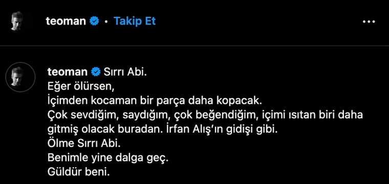 Sosyal medya hesabından paylaşım yapan ünlü müzikçi Teoman, Öncü’ye seslendi.