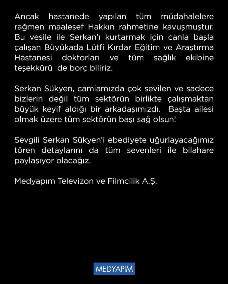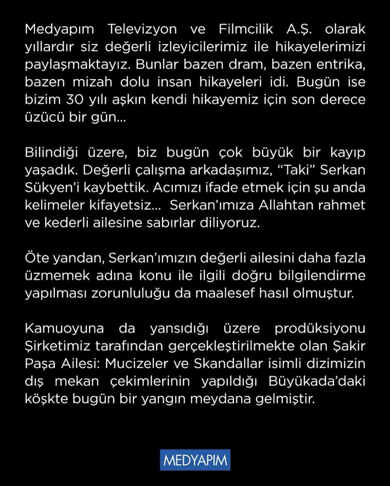 “Medyapım Televizyon ve Filmcilik A.Ş. olarak yıllardır siz kıymetli izleyicilerimiz ile öykülerimizi paylaşmaktayız. Bunlar bazen dram, bazen entrika, bazen mizah dolu insan kıssaları idi. Bugün ise bizim 30 yılı aşkın kendi öykümüz için son derece üzücü bir gün…