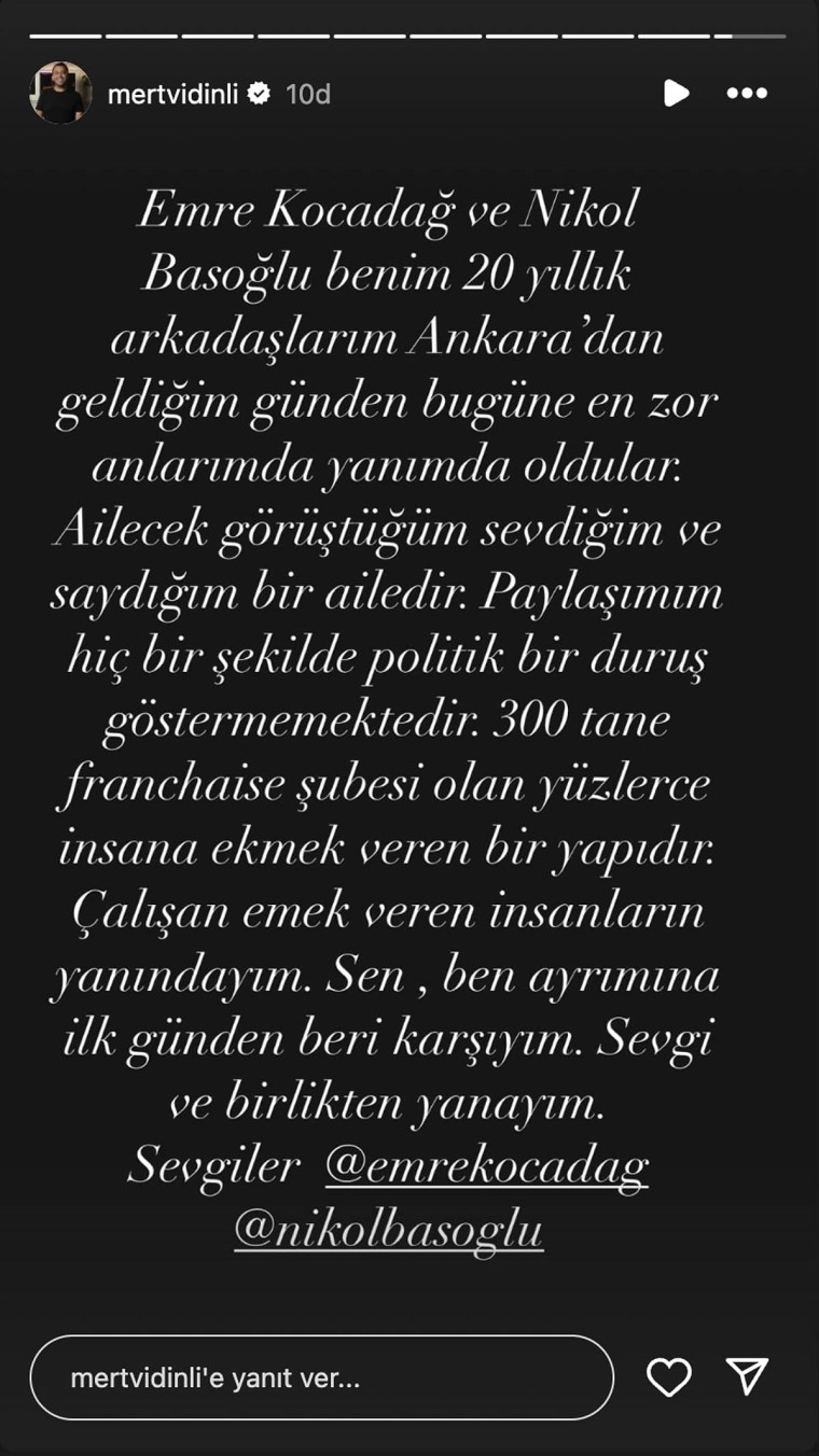 Artan tenkitler üzerine bir açıklama yayınlayan Mert Vidinli, paylaşımının politik bir duruş taşımadığını tabir etti. Vidinli, “Emre Kocadağ ve Nicole Başoğlu benim 20 yıllık arkadaşlarım. Ailecek görüştüğüm, sevdiğim ve saydığım bir ailedir,” kelamlarıyla yakın dostlarına takviye verdiğini belirtti.