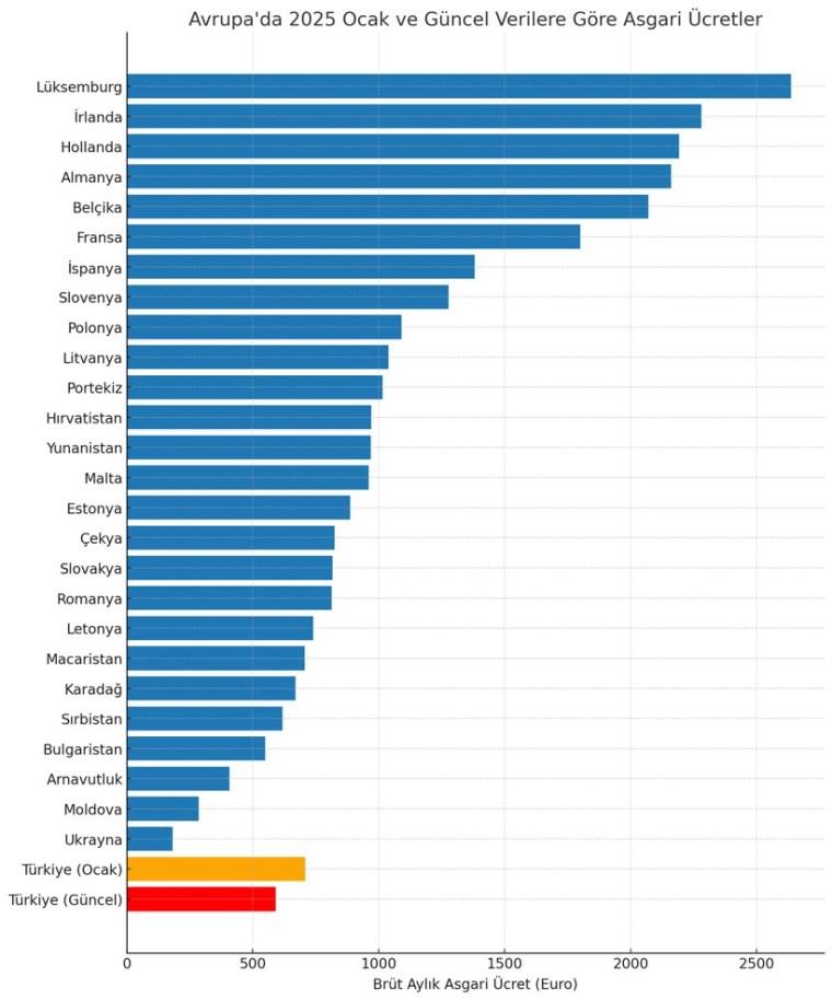 Eurostat bilgilerine nazaran, 2025 yılı başında Türkiye’deki brüt minimum fiyat 26 bin 5 TL olarak belirlenmişti ve o periyotta döviz kuru 36,73 TL idi. Bu hesaplamayla Türkiye’deki brüt minimum fiyat yaklaşık 708 Euro düzeyindeydi. Lakin son aylarda döviz kurundaki sert artış nedeniyle bu sayı değerli ölçüde düştü. Euro/TL kurunun 44 düzeylerine ulaşmasıyla, taban fiyatın Euro karşılığı yaklaşık 591 Euro’ya geriledi.