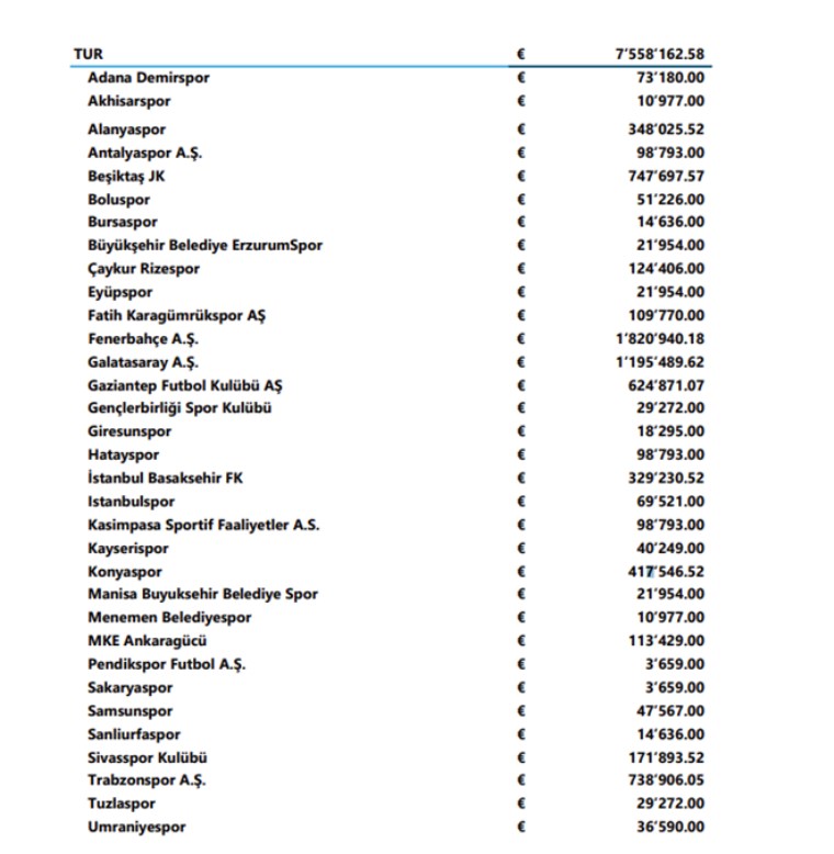 Listede 1 milyon 820 bin 940 Euro’luk gelirle Fenerbahçe birinci sırada yer aldı. Sarı-lacivertlileri Galaasaray 1 milyon 195 bin 489 Euro ile takip etti. Beşiktaş 747 bin 697 Euro ile üçüncü sırada yer alırken Trabzonspor 738 bin 906 Euro’luk geliri kasasına koydu.