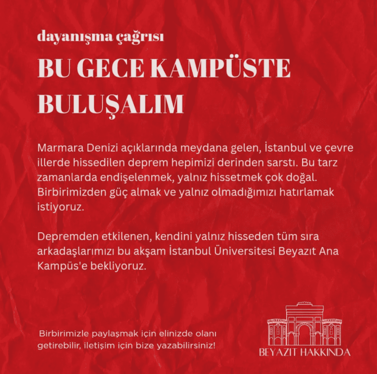 Depremden etkilenen, kendini yalnız hisseden tüm sıra arkadaşlarımızı bu akşam İstanbul Üniversitesi Beyazıt Ana Kampüs’e bekliyoruz.