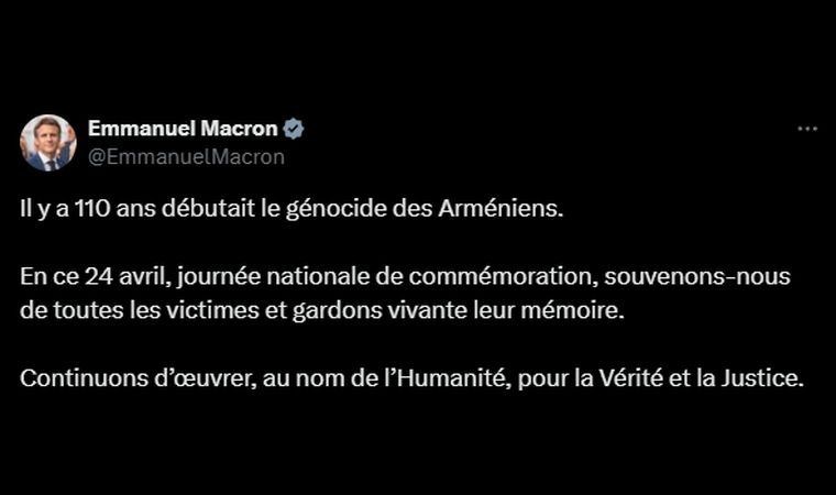 Fransa Cumhurbaşkanı Emmanuel Macron, 1915 olaylarına ait toplumsal medya hesabından yaptığı açıklamada 24 Nisan’ı “Ermeni Soykırımı Ulusal Anma Günü” olarak andı.