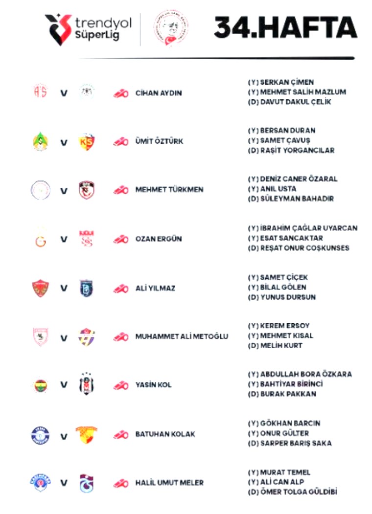Trendyol Süper Lig’de 34. haftanın maçlarını yönetecek hakemler aşikâr oldu.
