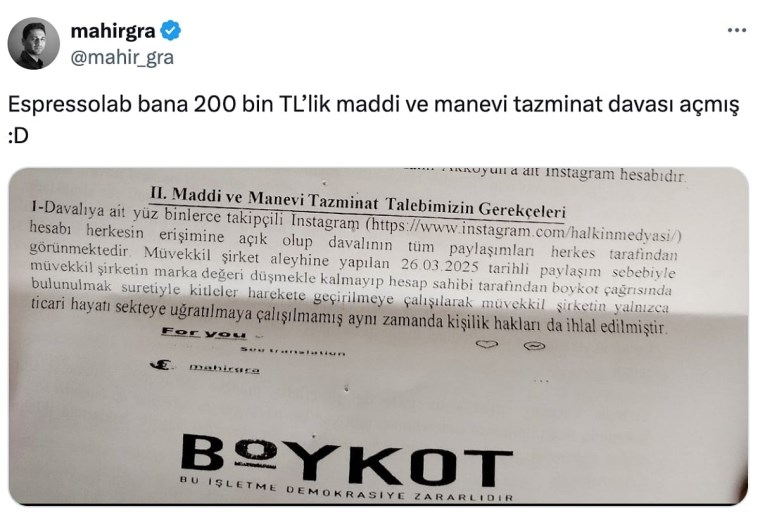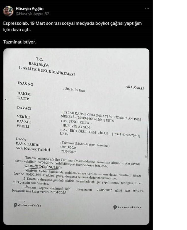Hüseyin Aygün, açılan tazminat davasını “Espressolab, 19 Mart sonrası toplumsal medyada boykot daveti yaptığım için dava açtı. Tazminat istiyor” kelamlarıyla duyururken, Uzman Akkoyun ise yaptığı paylaşımda “Espressolab bana 200 bin TL’lik maddi ve manevi tazminat davası açmış” sözlerini kullandı.