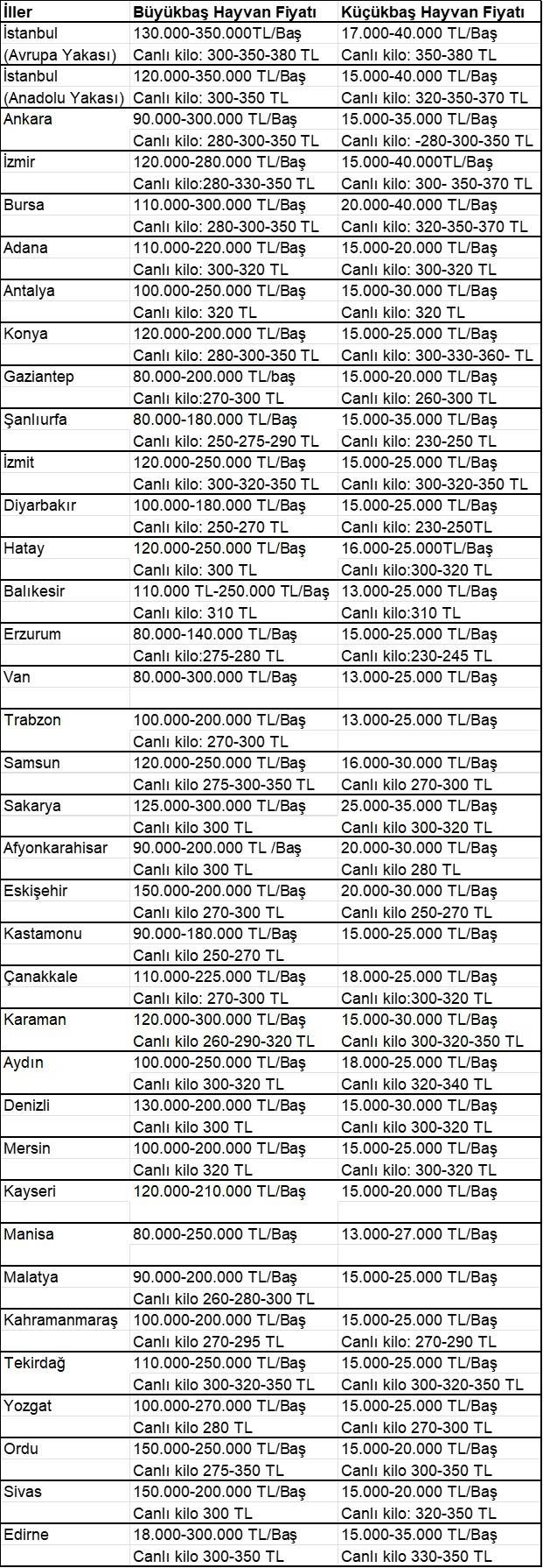 Büyükşehirlerde fiyatlar konusunda da bilgi veren Bayraktar, “İstanbul Avrupa yakasında büyükbaş fiyatları 300-380 lira, Anadolu yakasında 300-350 lira ortasında değişiyor. Ankara ve İzmir’de ise 280-350 lira düzeylerinde seyrediyor. Küçükbaş fiyatları ise İstanbul Avrupa yakasında 350-380 lira, Anadolu yakasında 320-370 lira, Ankara’da 280-350 lira, İzmir’de 300-370 lira arasında” tabirlerini kullandı.