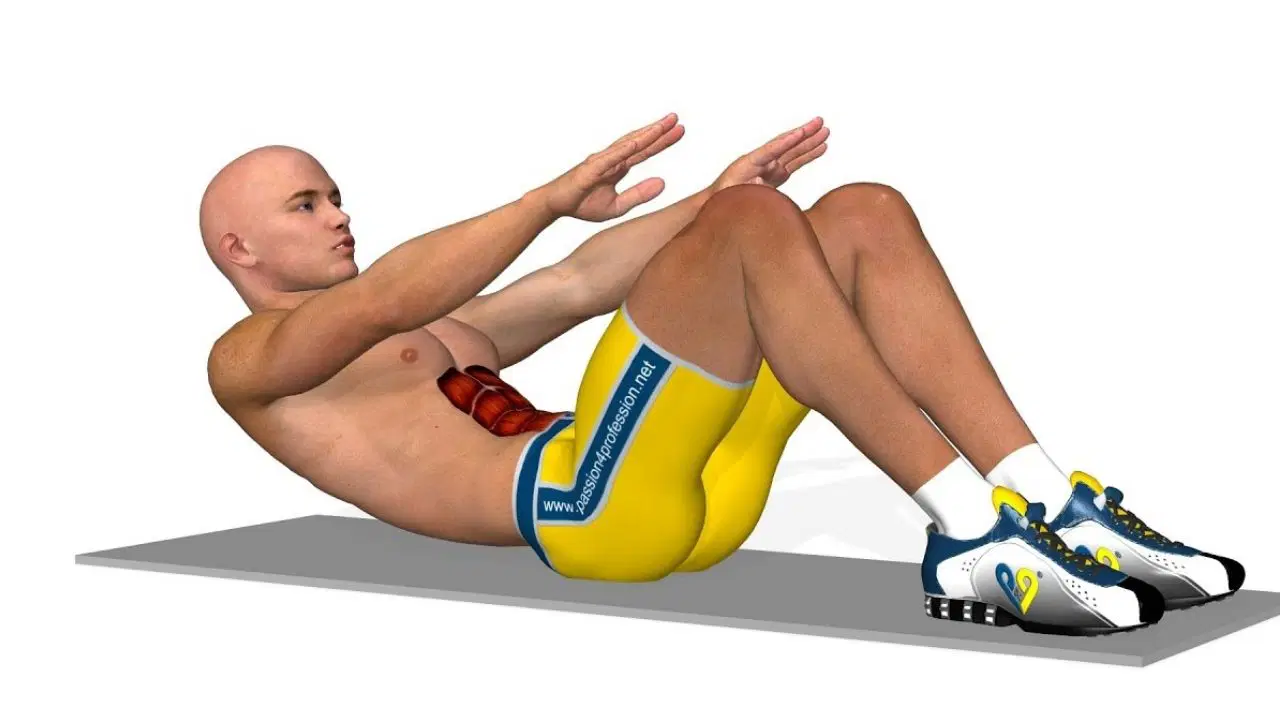 Sırtüstü yatın, dizleri bükün. Eller başın gerisinde. Karnınızı sıkarak üst gövdenizi yavaşça üst kaldırın.