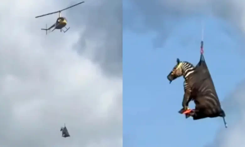 Yetkililerin paylaştığı görüntüde, zebranın ağ içinde, yalnızca başı dışarıda kalacak halde helikoptere bağlandığı ve inançla taşındığı görülüyor.