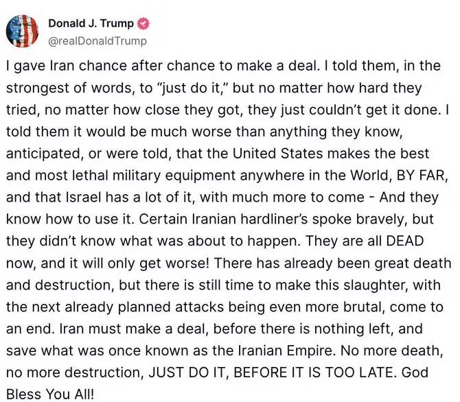 “Çok büyük yıkım oldu ancak yeni hücumlar hâlâ durdurulabilir. İran artık harekete geçmeli ve imparatorluğunun geriye kalanını kurtarmalı. Artık vefat ve yıkım istemiyoruz. Harekete geçin. Çabucak. Çok geç olmadan.”