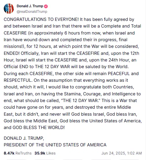 “HERKESE TEBRİKLER! İsrail ve İran ortasında, yaklaşık 6 saat içinde (her iki tarafın da hâlihazırda devam eden son operasyonlarını tamamlamasının ardından) geçerli olacak biçimde, TAM VE KAPSAMLI BİR ATEŞKES konusunda tam mutabakat sağlanmıştır!